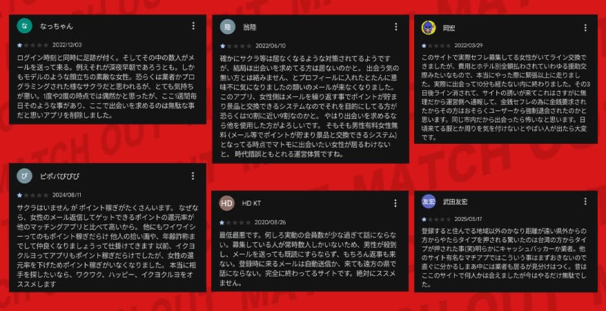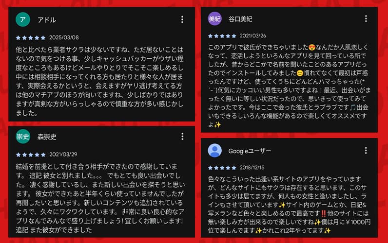 Google Play Storeの高評価レビューを確認してみると、「他と比べて業者は少ないからまだマシ」といったマイナス寄りだけどアプリ自体は評価しているものや、情報は古いけど出会えたといった報告がいくつかあったな。