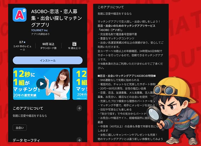 ASOBOは「12秒に1組がマッチング」といったキャッチコピーを前面に出していて、匿名で気軽に出会える出会い系サービスとして紹介されている。