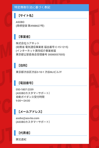 じゃあ次は、ASOBO(アソボ)のインターネット異性紹介事業の届出や、運営会社の情報をしっかり確認していくな。