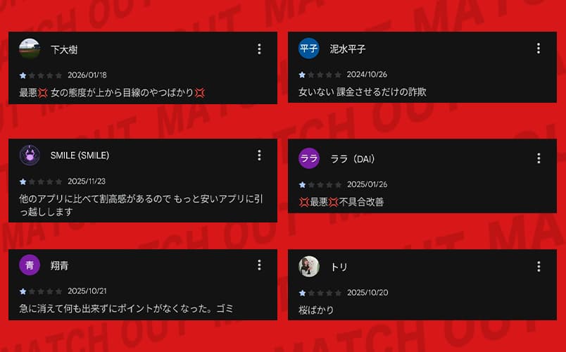 女性側ですが、こういうアプリの実態が知れて助かりました。出会い目的で使う人が不安になるのも無理ないですね…。