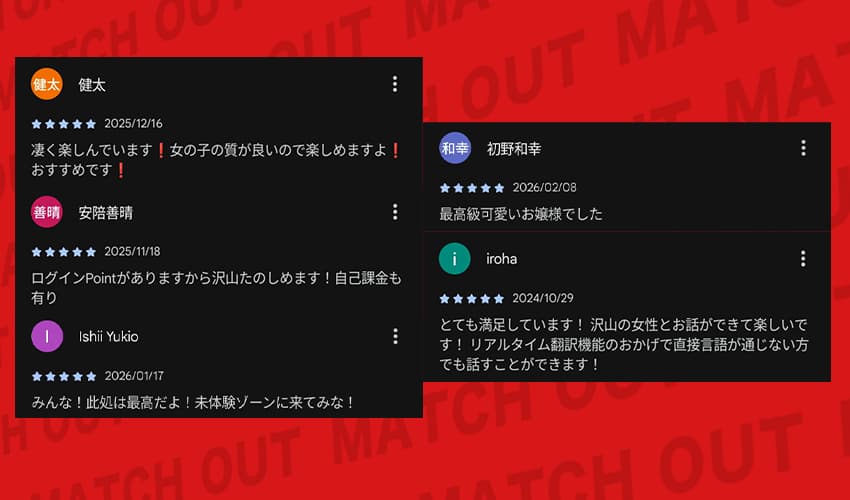 Google Play Storeの高評価レビューでも、会話自体を楽しむ声が多く、出会いについての声は見当たらなかったね。