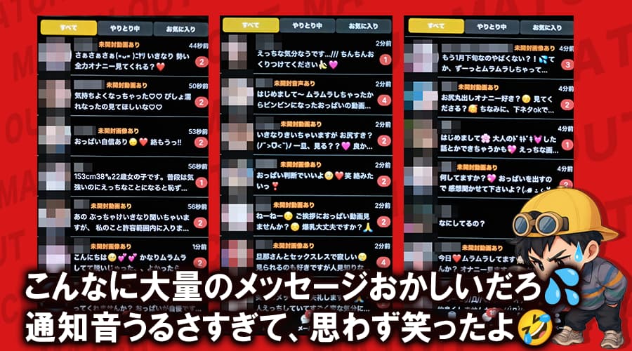 自分だけじゃなかったんですね。大量メッセージ来るの不自然すぎると思って検索しました。同じ体験談があって少し安心しました。