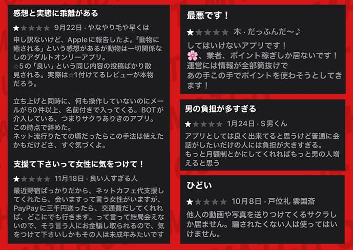 口コミと実体験がここまで一致するアプリは、利用上かなりのリスクがあるから注意が必要だぞ。
