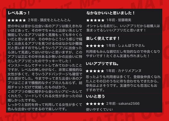 App Storeで確認できた高評価レビューも、「楽しく使えてる」とか「いいアプリ」とかのしょうもない内容ばかりだったよ。
