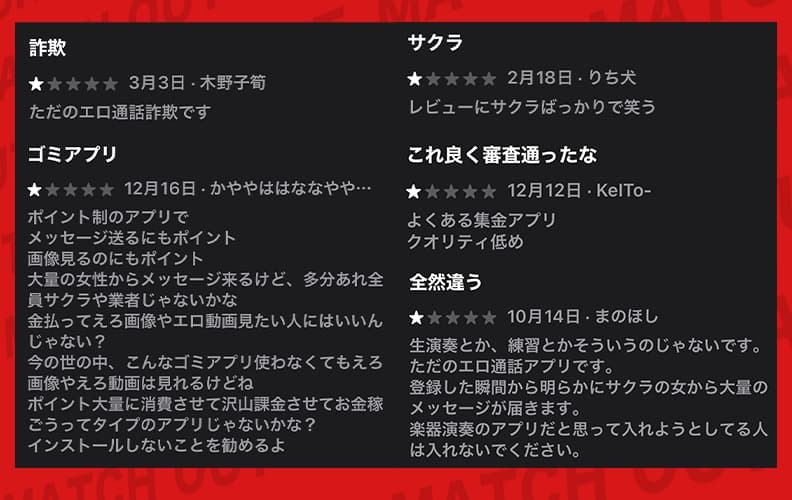 App Storeの低評価レビューも、「詐欺」や「サクラだらけ」、「ゴミ」といった声が多く、実際の内容とも相まって信ぴょう性は高いと感じたぞ。
