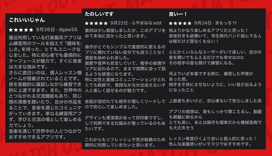 高評価レビューの中には、紹介文と同じような演奏アプリの内容を書いているものも多く、かなり不自然に感じたぞ。