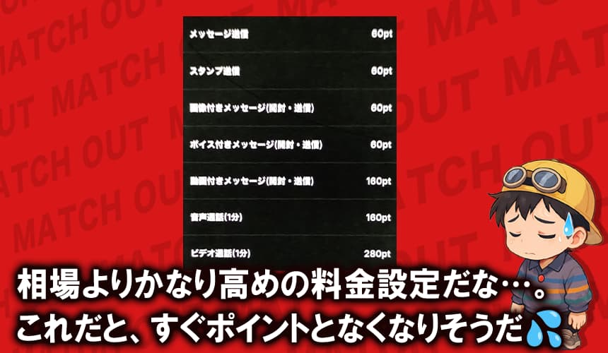一般的な出会い系アプリなら、メッセージ1通50円以下、定額制で使えるものも多いから、この料金設定は気軽に使える水準とは言えない。