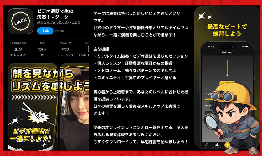 ダークのビデオ通話アプリは、紹介ページを見る限り「ビデオ通話で生の演奏を楽しめるアプリ」「世界中の演奏仲間とリアルタイムでつながれる」といった内容で案内されているんだよな。