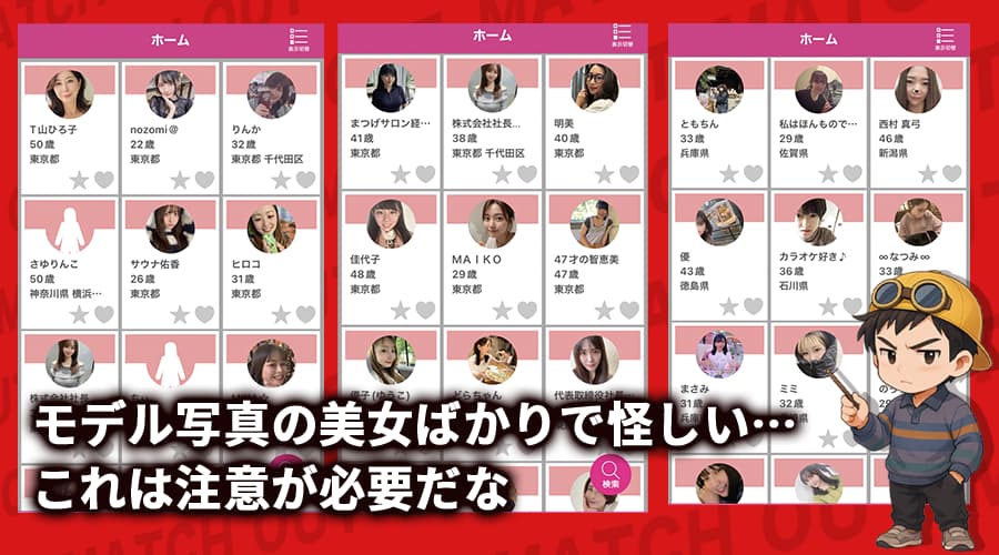 具体的には、「登録直後から美人ばかりが連絡してくる」「話が噛み合わない」「質問ばかり返ってくる」といった内容が目立つ。