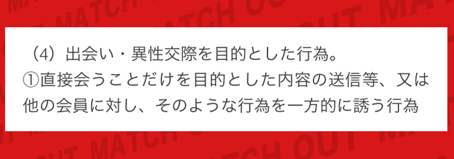 加えて、利用規約を読むと「出会い・異性交際を目的とした利用は禁止」と書かれています。
