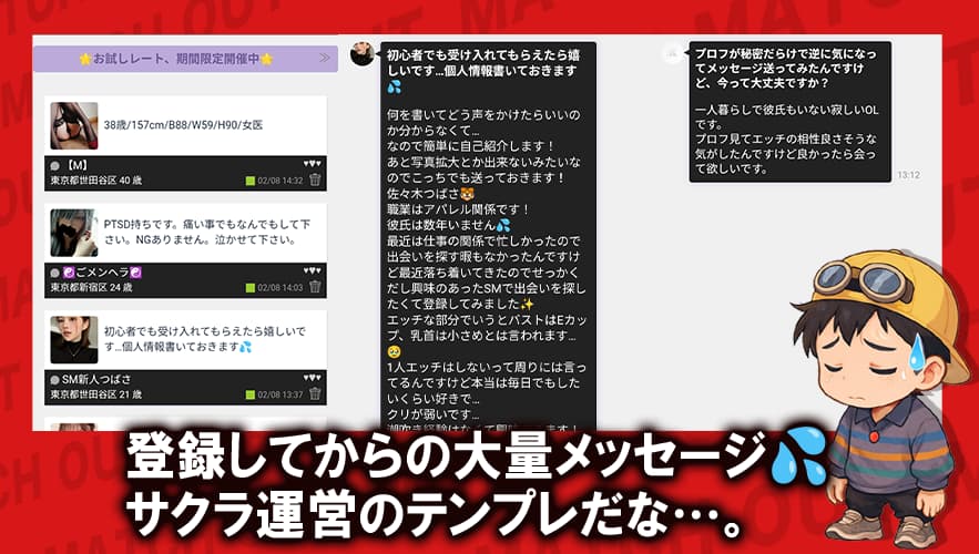 1. 登録直後からサクラ疑惑の強いエロ誘導メッセージが大量に届く