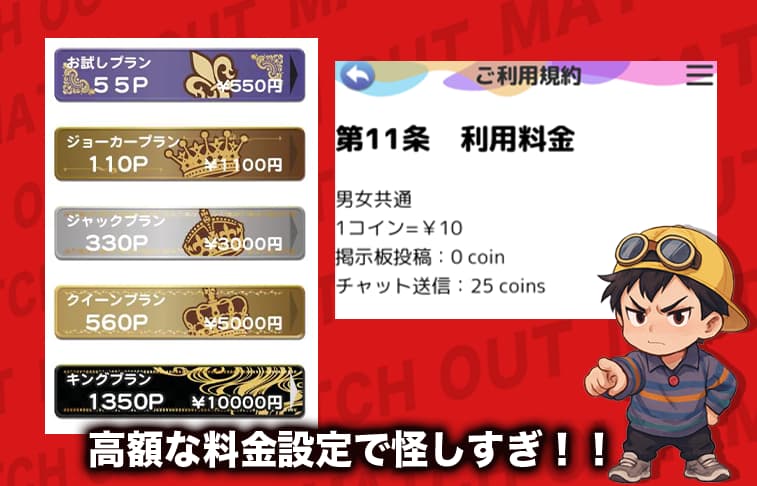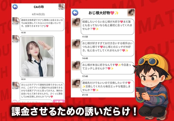 - チャット1通250円と高額で、課金リスクが非常に高い