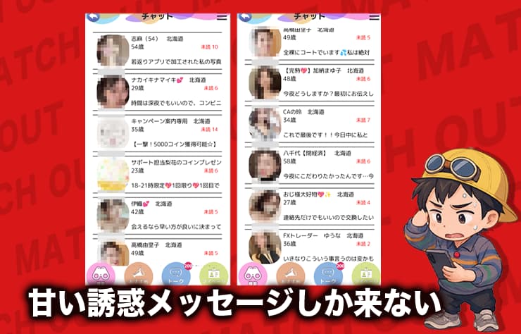 危ないところでした…。登録してすぐメッセージ来まくって違和感あったんですが、この記事読んで確信しました。
