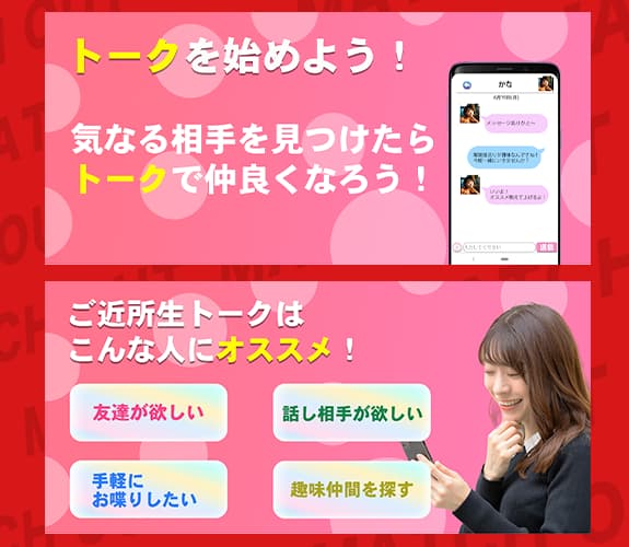 ご近所生トークは、「近所の人と気軽にトークできる」「生トークで距離が縮まる」みたいな雰囲気で紹介されている出会い系アプリだな。