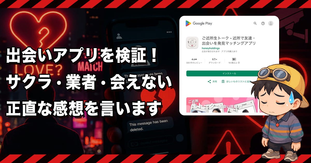 こういう記事ほんと助かります。出会えない系アプリって見分けつかないから、体験ベースで書いてくれるのはありがたい。