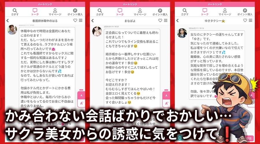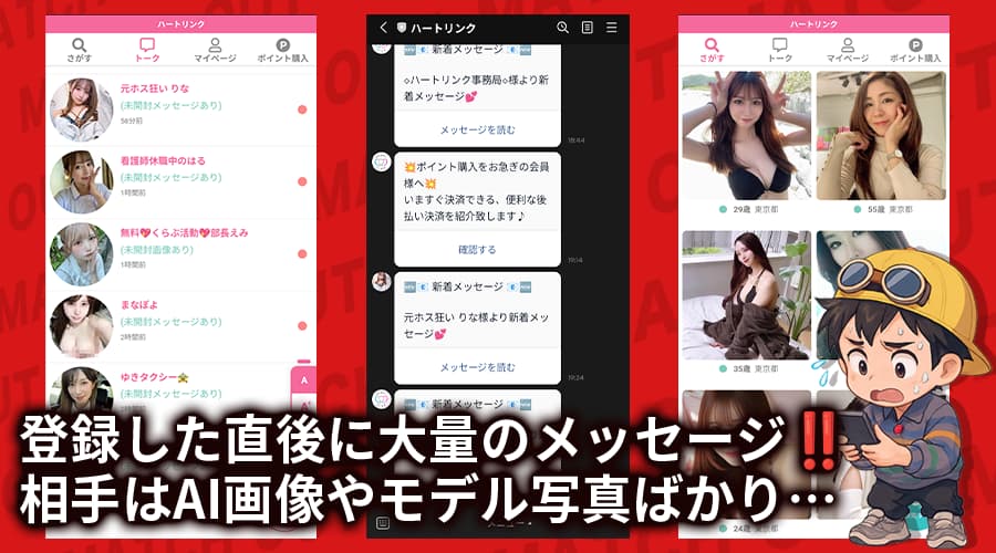 ハートリンクってLINE登録したら、いきなり女性から大量にメッセージが来て怖くなりました…これってサクラですか?