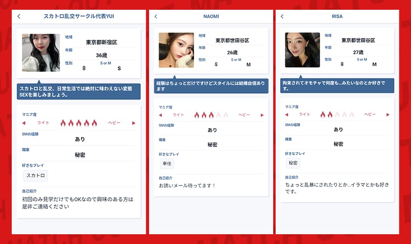 SMやアブノーマル嗜好に興味がある人同士が、メッセージを通じて交流できる場を提供している、といった内容が強調されているね。