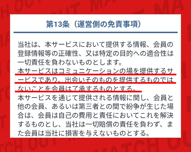 ただし、利用規約を読むと「出会いそのものを提供するサービスではない」といった、責任を回避するような記載が含まれている点は気になるところだ。