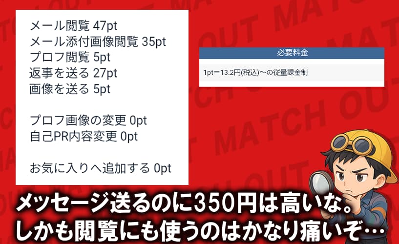 1pt=13.2円(税込)換算なので、メールを見るだけで約620円、返事を送るだけでも約350円かかる計算になるな。