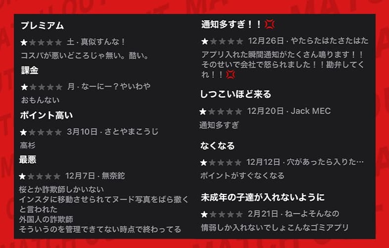 実際、App Storeの低評価レビューでも、ポイントの高さや課金圧の強さ、詐欺的な動きに対しての声が多かったね。