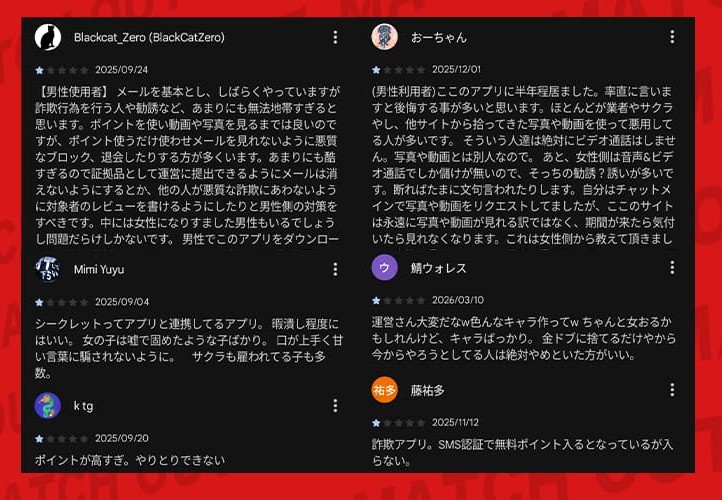 Google Play Storeの低評価レビューでも、「詐欺ばっかり」「ポイント高すぎ」といった声が多かった。