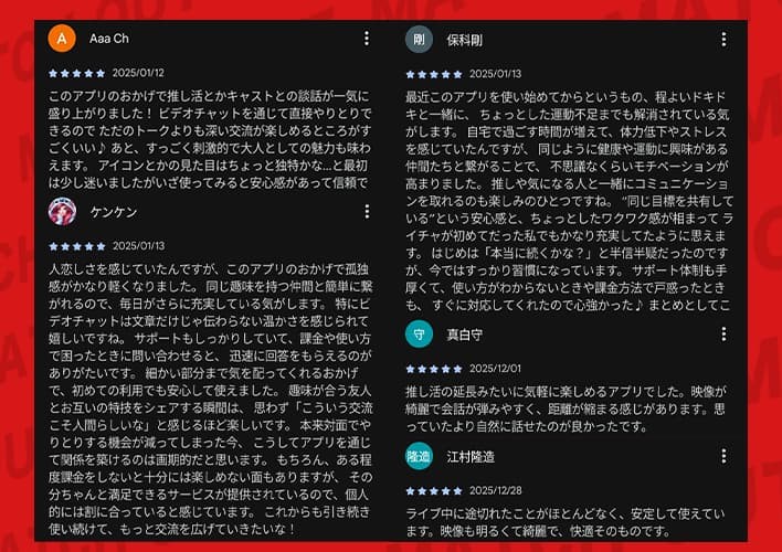 Google Play Storeの高評価レビューも、会話を楽しむ声が多くて、出会いについての声は見当たらなかったな。