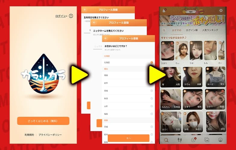 友人Tマサ、最近広告でよく見るカラッカラってやつ、登録した瞬間に女の人からめっちゃメッセージ来たんだけど…これ大丈夫なやつ?正直サクラっぽくて怖いんだよな💦