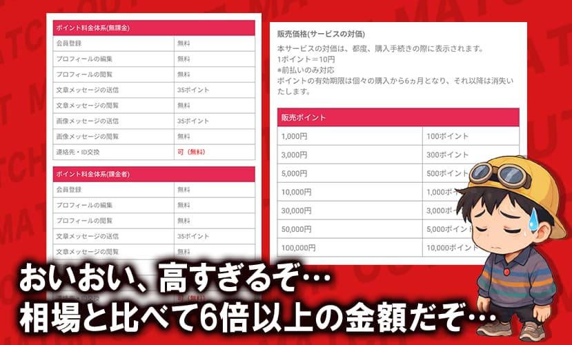 大手の優良出会い系サービスと比べると、1通あたりのメッセージ送信が約350円相当となり、かなり高額になる。