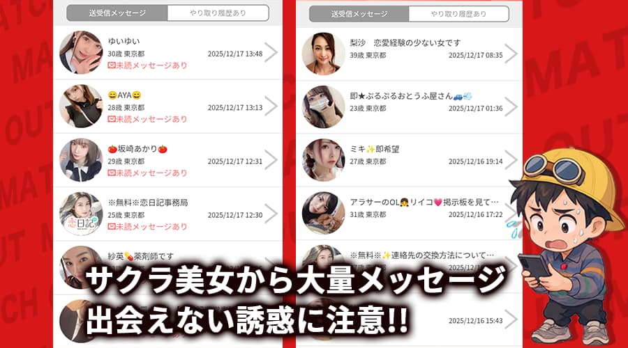 登録直後から即会いを匂わせる美女が複数現れる流れは、サクラを疑う声が多い典型的なパターンです。