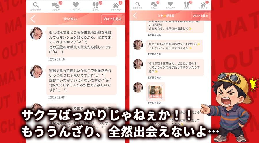 - 登録直後から即会いを匂わせる相手が多く、サクラや業者が非常に多い