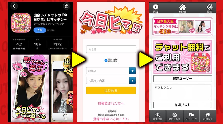 ここからは、俺が今日ヒマ!?(今日暇チャット)を実際にインストールして、登録から使ってみた流れをリアルに書いていくぞ。