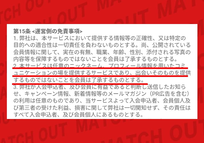 しかも利用規約には「コミュニケーションの場を提供するサービスであり、出会いそのものを提供するものではない」って趣旨の内容が書かれている。