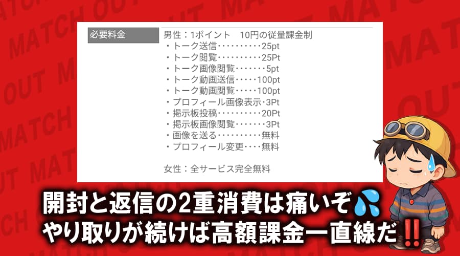 送信も閲覧も有料だと、相手が業者やサクラのような動きでもポイントが消費され、気づかないうちに高額課金につながる恐れがあります。