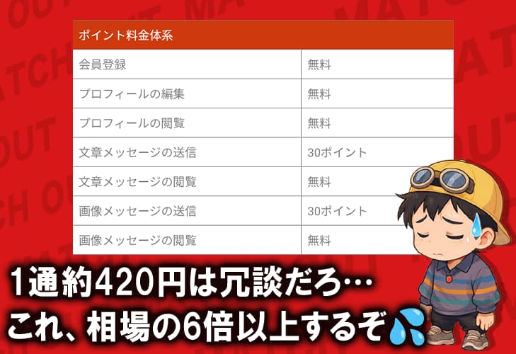 - メッセージ1通400円超えの高額課金で出会いに繋がらない