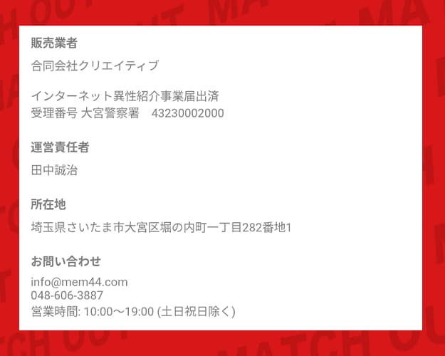 | インターネット異性紹介事業の届出 | あり(受理番号:43230002000) |