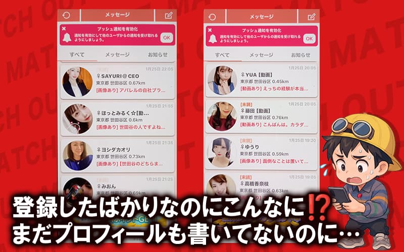 先輩Kさんみっちょんってアプリ、登録した瞬間に女の子から大量にメッセージが来たんだが…これって普通なんか?💦