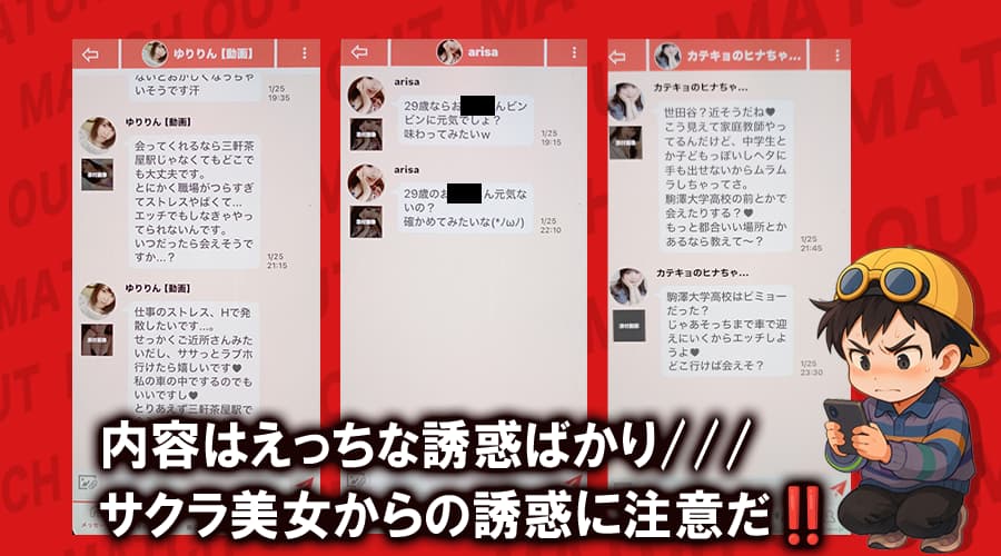 - 登録直後から不自然な大量メッセージが届く