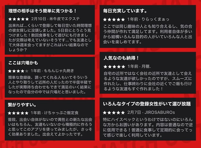 App Storeの高評価レビューでも、具体的に会えたというようなものはなくて、サクラっぽいレビューばかりだった。