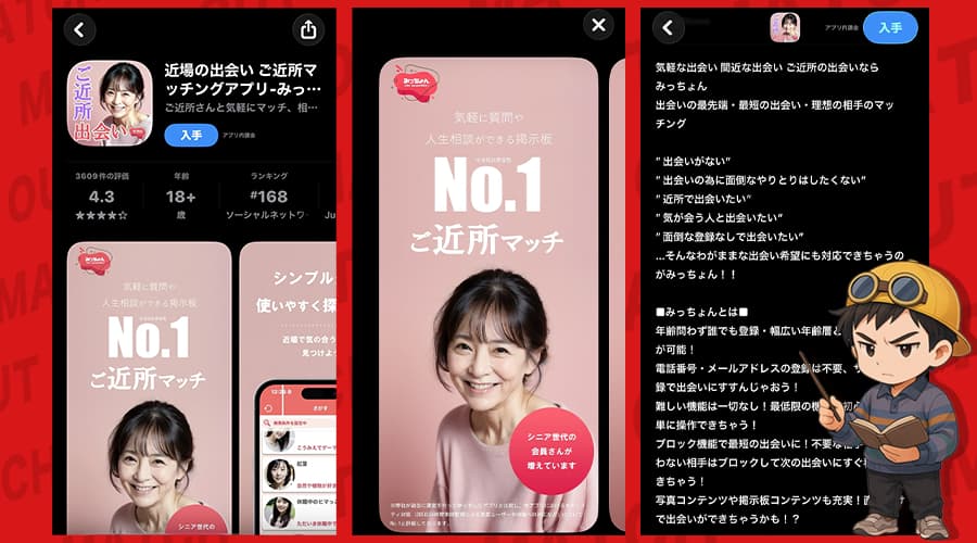 みっちょんは、紹介ページを見る限り「近場の出会い」「ご近所マッチング」をウリにしている出会い系アプリだな。