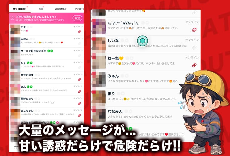 なのに、登録後に甘い誘惑っぽいメッセージが大量に来るって話も出てて、ここはギャップがデカい…(;・∀・)