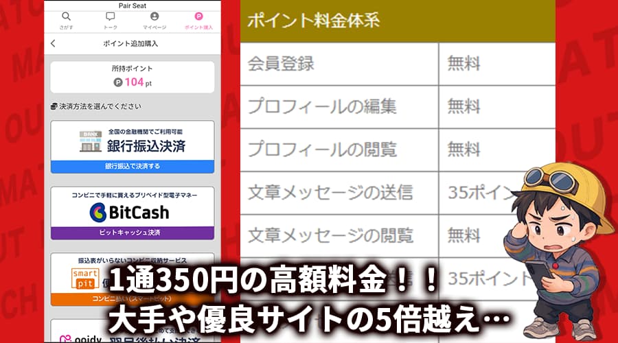 PairSeat(ペアシート)は1ポイント=10円の従量課金制で、文章や画像メッセージの送信ごとに35ポイント、つまり1通350円が必要になる。