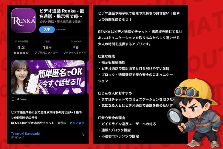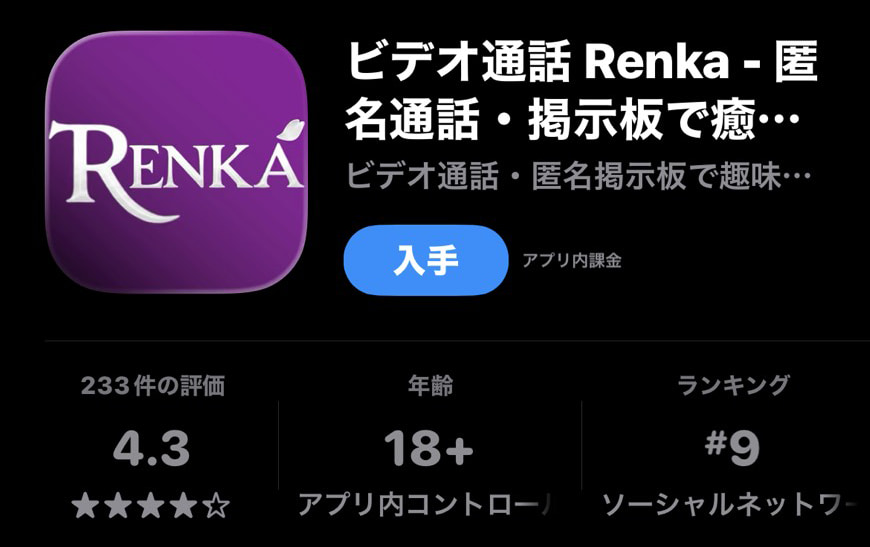 Renka(レンカ)は、紹介ページだと「ビデオ通話・匿名通話・掲示板で癒やしの時間を過ごせるアプリ」みたいな立て付けで書かれいるみたいだな。