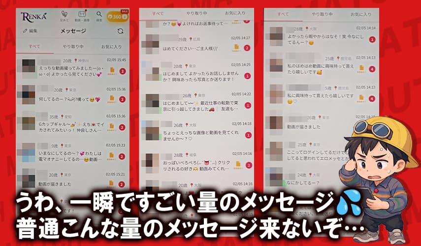 - 登録直後からメッセージが大量に来て、サクラや業者を疑った