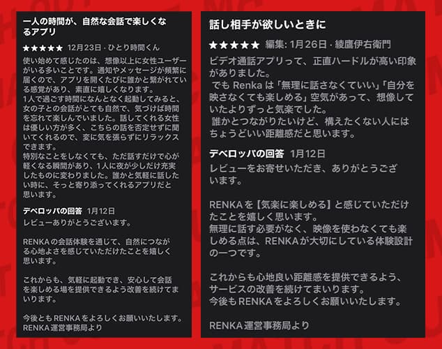 App Storeの高評価レビューでは、「通話が楽しめた」「会話が楽しかった」みたいな声ばかりで出会いについての声はなかったぞ。