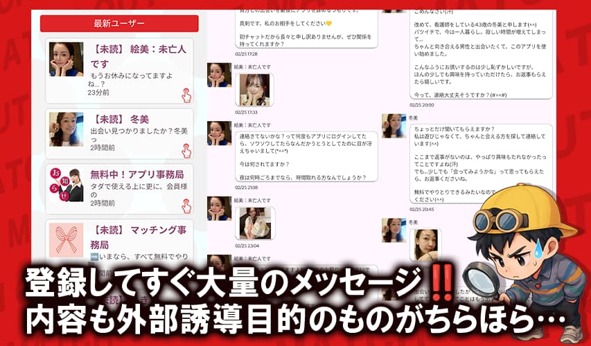 この時点で、「じゃあ、アプリ内で飛んでくる甘い誘いは何なんだ?」って疑問が出てくるよな。
