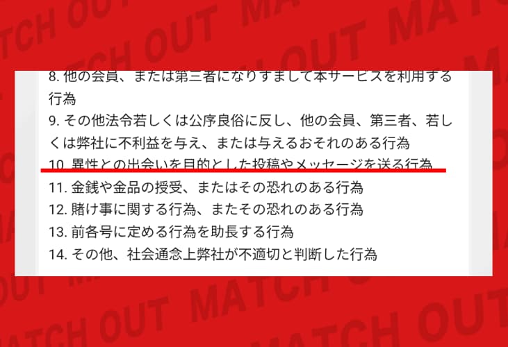しかも、利用規約を確認すると、出会い及び異性との交際を目的とした利用は禁止としっかり書かれている。