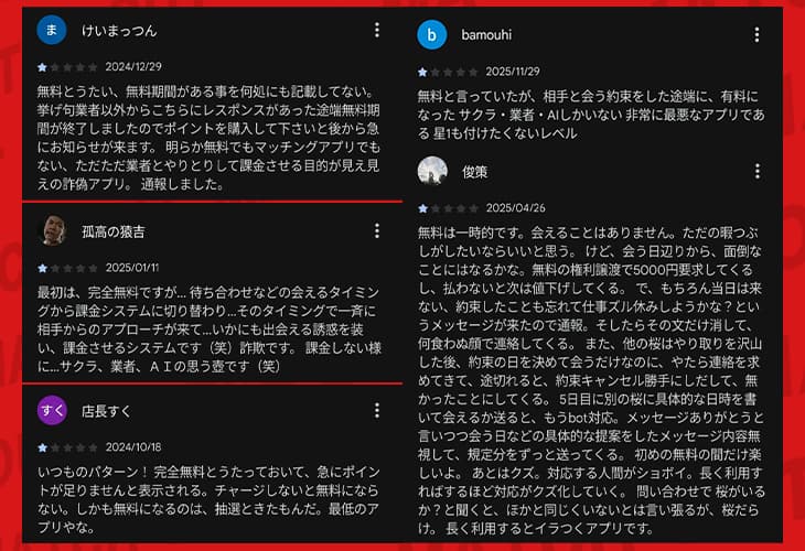 出会える可能性よりも、サクラ・業者・課金トラブルのリスクのほうが目立つ結果だった。