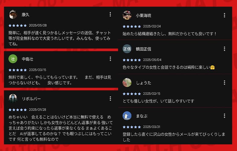 Google Play Storeの高評価レビューでも、無料だからいいといった声や会話できて楽しいといった声ばかりで、出会いについての声はなかったね。