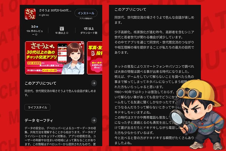まず「さそうよ」アプリの内容だけど、紹介ページを見る限りでは、30代から60代向けの世代間交流チャットアプリとして案内されているな。