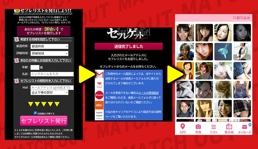 流れとしては、タイプを選んで、地域や年齢とメールアドレスを入れると、セフレリストが発行されるって説明だった。